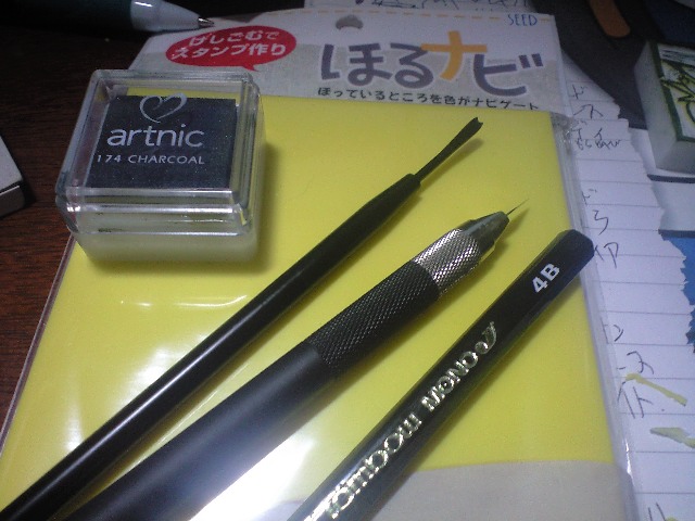 4Bえんぴつ。普通のHBより粉が写りやすい反面、彫っている際に手で触るとにじみます。