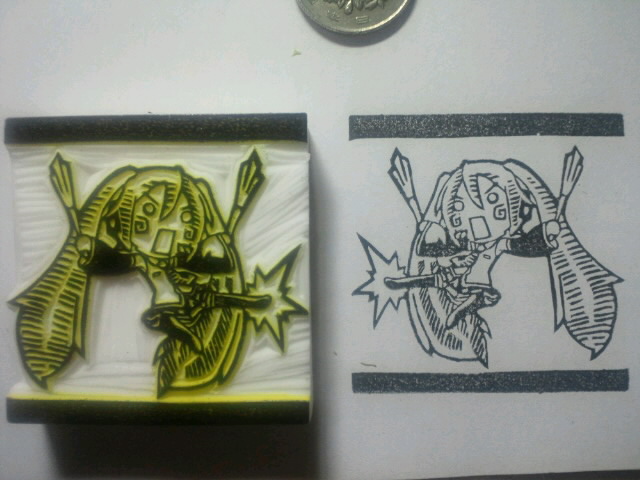 これですが、イラストを消しゴムに写し取り、その線を元にナイフで削っています。